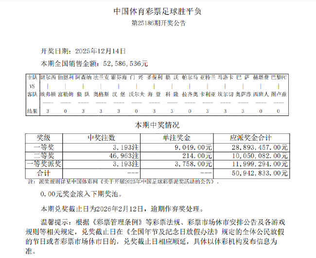 北京时间12月14日,足彩第25186期开奖结果揭晓。本期足彩派奖头奖共开出3193注,单注奖金9049元,533万滚存遭清空。