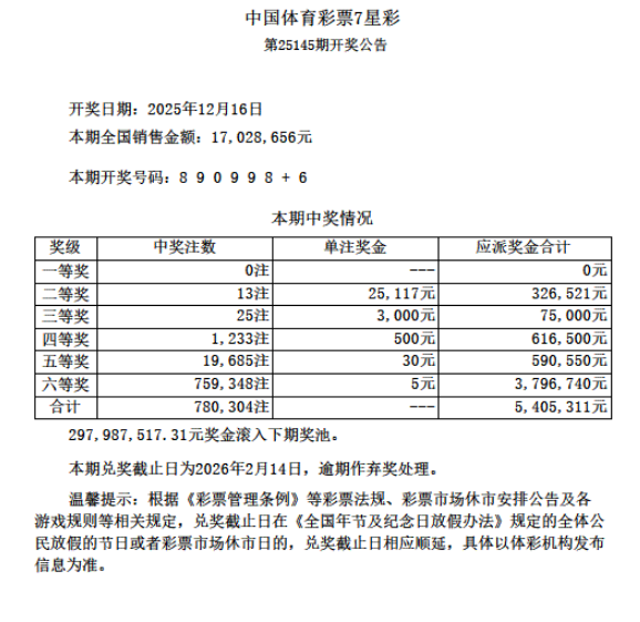 7星彩第25145期一等奖空开 奖池2.97亿元