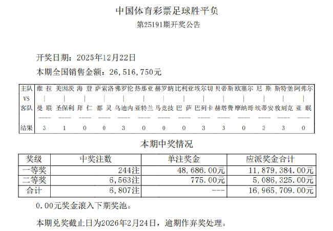北京时间12月22日,胜负彩第25191期开奖结果揭晓。本期14场1等开出244注,单注奖金48686元;14场2等开出6563注,单注奖金775元;任九开出31825注,单注奖金466元。本期胜负彩销量为26,516,750元,任九投注总额为23,180,498元。