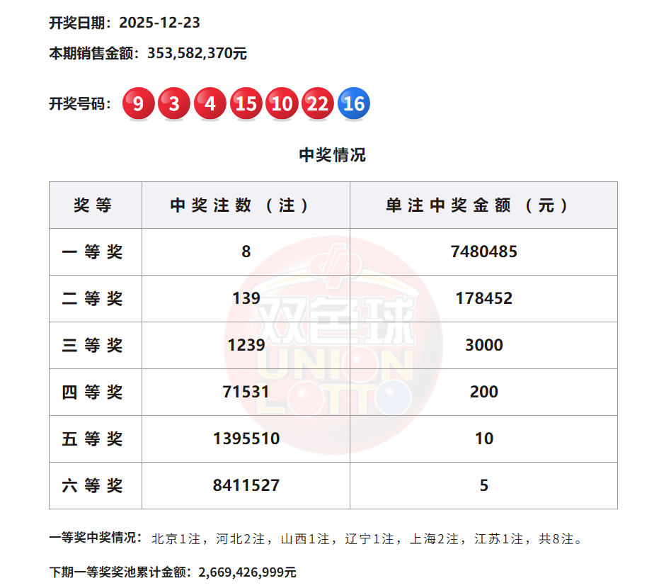 12月23日晚,中国福利彩票双色球游戏第2025148期开奖,本期双色球开奖号码为