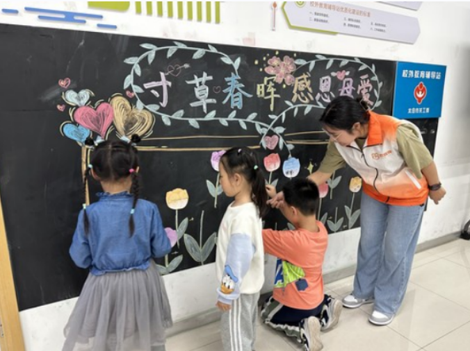 江苏省太仓市科教新城儿童“关爱之家”组织工作人员与孩子们一起手绘黑板报。供图/科教新城儿童“关爱之家”