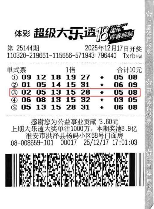 然而,正是这张看似随意、实则充满个人风格的自选票,却给刘先生带来了意想不到的惊喜。票面上的第三注号码“02、05、13、15、28 + 05、08”与当期一等奖号码完全吻合,成功命中一等奖;不仅如此,第五注号码还中得了1注五等奖,第一注号码也收获了1注九等奖。多奖叠加之下,刘先生最终获得的奖金总额达到了6101845元。