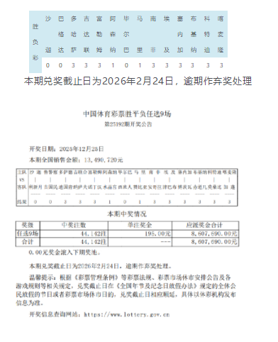 北京时间12月25日,胜负彩第25192期任九开奖结果揭晓。本期任九井喷44,142注,单注奖金195元,本期任九的投注总额为13,490,720元。