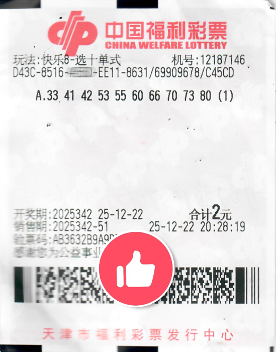 岁末迎新之际,福运如潮水般涌向津门。12月22日,快乐8游戏第2025342期开奖,天津购彩者再展风采,成功斩获“选十中十”1注,为天津彩市添上了一抹绚丽的喜庆色彩。