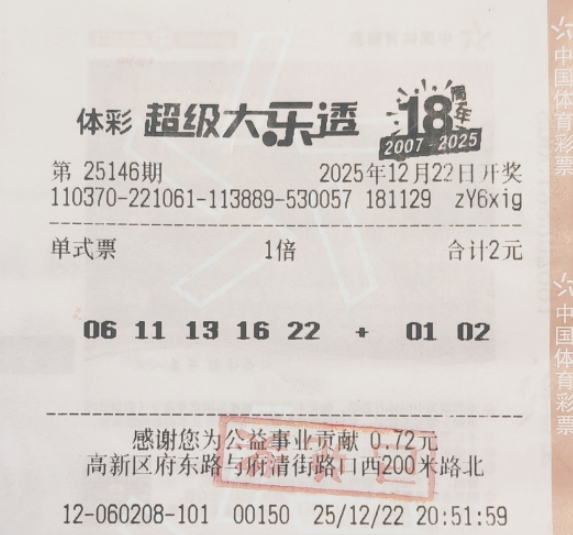 12月22日夜晚,体彩大乐透第25146期开奖的时刻来临,当期开出的号码为“06、11、13、16、22 + 02、03”。就在这期开奖中,一位来自潍坊的大叔成为了幸运儿,成功斩获二等奖1注,奖金高达15.1万元。