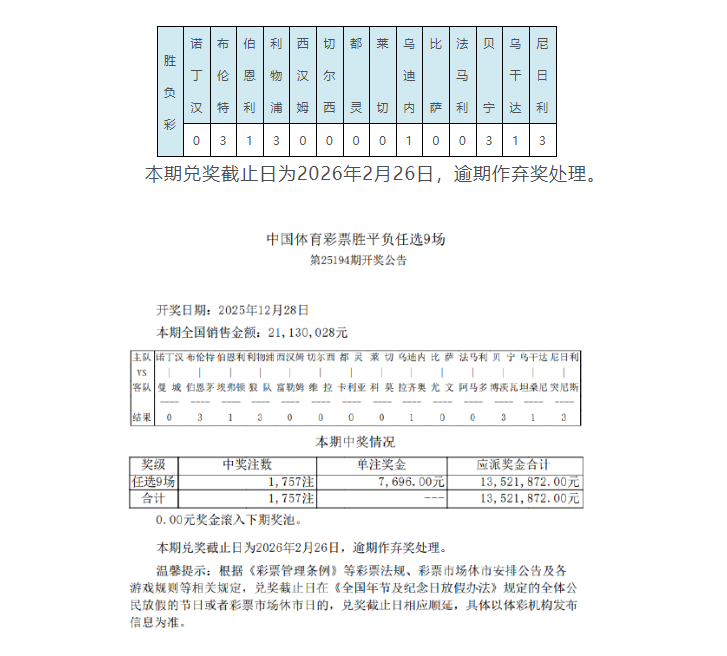 北京时间12月28日,足彩第25194期开奖结果揭晓。本期任选九场开出1,757注,单注奖金7,696元。本期任九投注总额为21,130,028元。