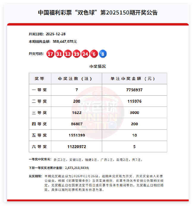 12月28日晚,中国福利彩票双色球游戏第2025150期开奖,本期双色球开奖号码为