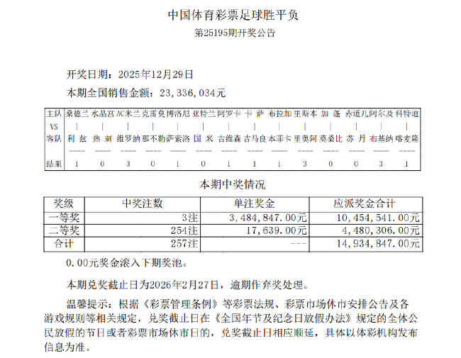北京时间12月29日,胜负彩第25195期开奖结果揭晓。本期胜负彩一等奖开出3注,单注奖金3,484,847元;二等奖开出254注,单注奖金17,639元;任选九场开出3,705注,单注奖金3,543元。本期胜负彩销量为23,336,034元,任九投注总额为20,511,470元。