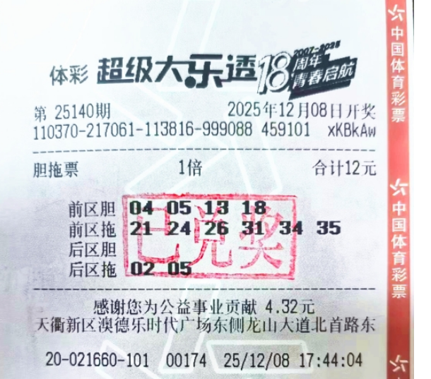 近日,体彩大乐透中奖喜讯再度降临德州,一位幸运儿凭借一张12元彩票,在第25140期开奖中,将1注二等奖和5注五等奖收入囊中,总奖金达136597元,宛如收到一份特别的新年贺礼。