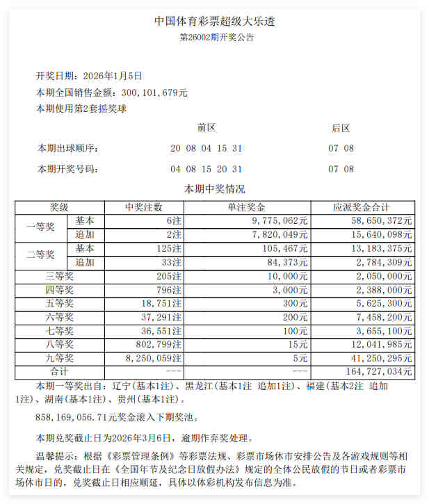 北京时间1月5日晚,体彩大乐透第26002期开奖,当期开奖号码为:前区04 08 15 20 31,后区07 08。