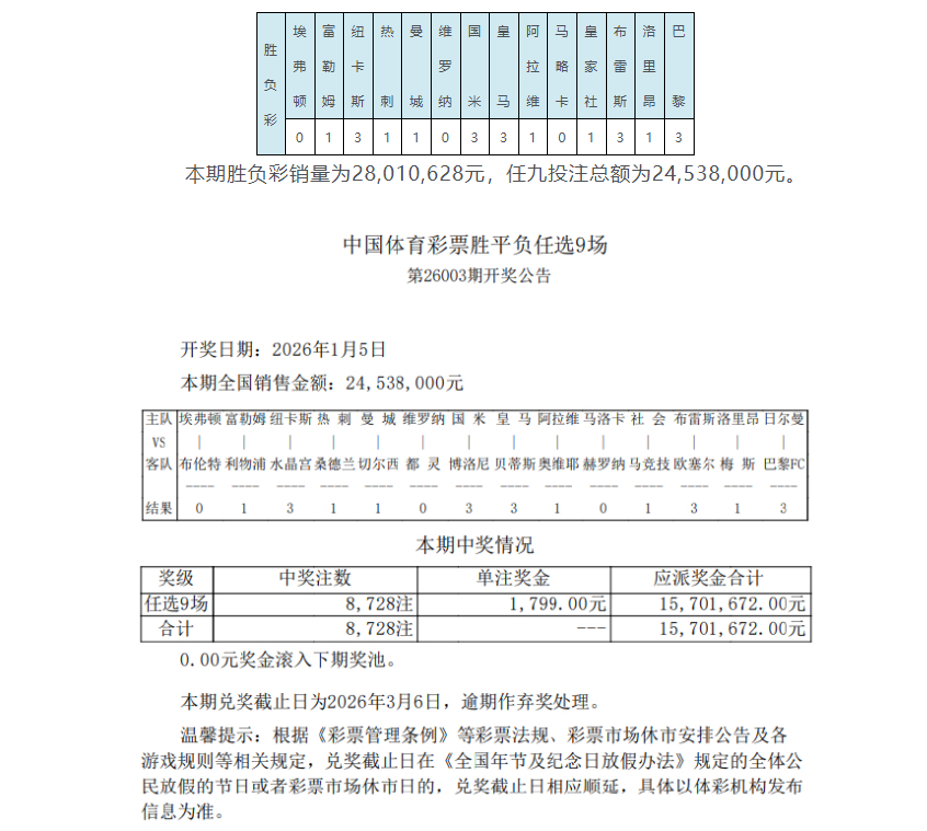 北京时间1月5日,足彩第26003期任九开奖结果揭晓。本期任九开出8728注,单注奖金1799元。本期任九投注总额为24,538,000元。