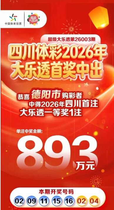 根据德阳市体育局的消息,德阳体彩在2026年迎来了四川首注大乐透一等奖,奖金高达893万元。此次中奖发生在2026年1月7日的大乐透第26003期,开奖号码为:02 09 11 15 16 +02 04。本期全国共中出一等奖7注。
