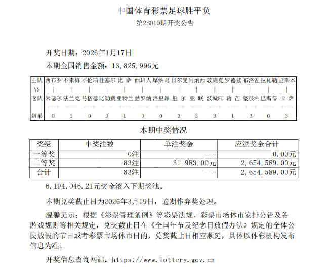 北京时间1月17日,胜负彩第26010期开奖结果揭晓。本期足彩头奖空开,二等奖开出83注,单注奖金31,983元,6,194,046元奖金滚入下期奖池;任九开出769注14,528元。本期胜负彩销量为13,825,996元,任九投注总额为17,456,776元。