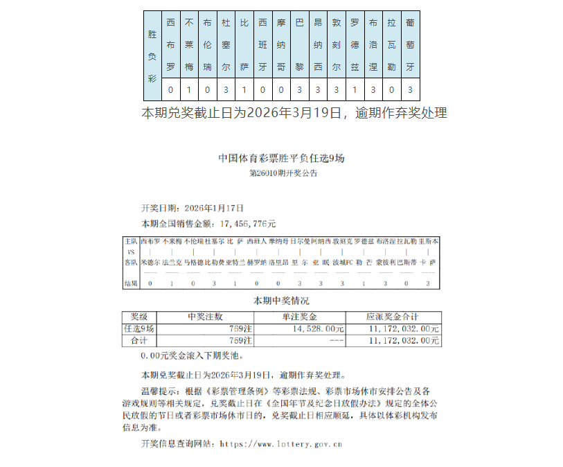 北京时间1月17日,胜负彩第26010期任九开奖结果揭晓。本期任九开出769注,单注奖金14,528元,本期任九的投注总额为17,456,776元。