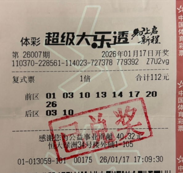 1月17日,体彩大乐透第26007期开奖,号码为01、03、13、20、26 + 03、10,全国共开出18注一等奖,其中1注花落济南市长清区。