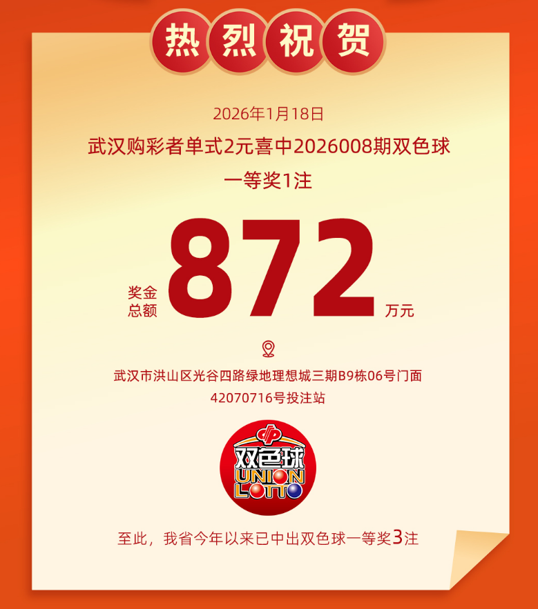喜报!湖北彩民勇夺双色球 2026008 期 872 万大奖