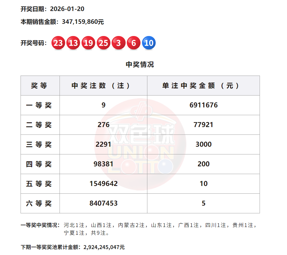 当期全国销量为3.47亿多元。计奖后,双色球奖池金额为29.24亿多元。下期,彩民依然有机会2元中得1000万。
