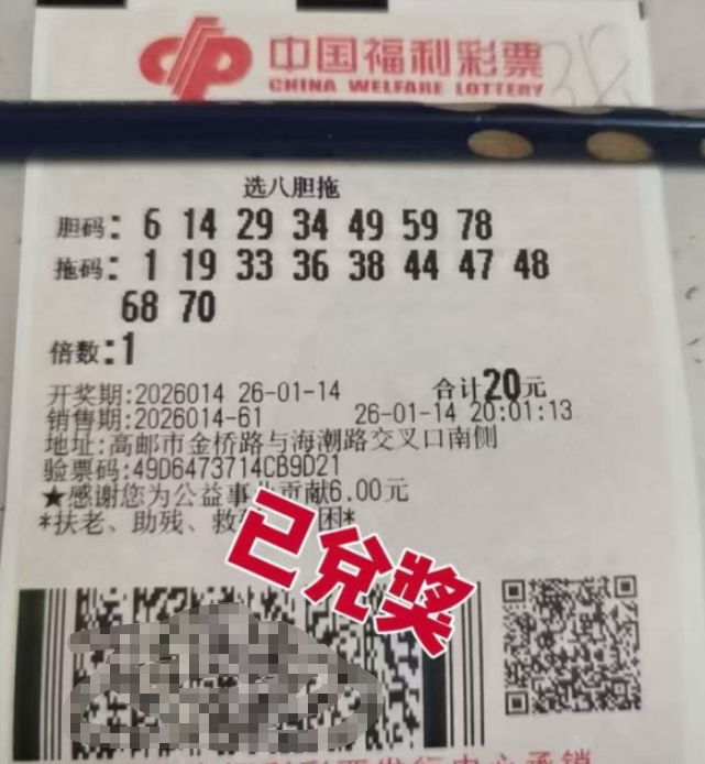 1月14日,福彩快乐8游戏第2026014期如期开奖。扬州高邮市金桥路32100422销售点传来振奋人心的喜讯——有幸运购彩者中出5.72万元奖金!