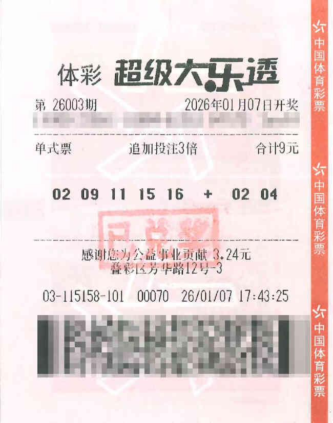 2026年1月7日,超级大乐透第26003期开奖,前区号码02、09、11、15、16,后区号码02、04,全国7注一等奖尘埃落定。其中,广西桂林中出3注追加一等奖,单票奖金高达4822万元,一举刷新广西体彩最高奖金纪录。