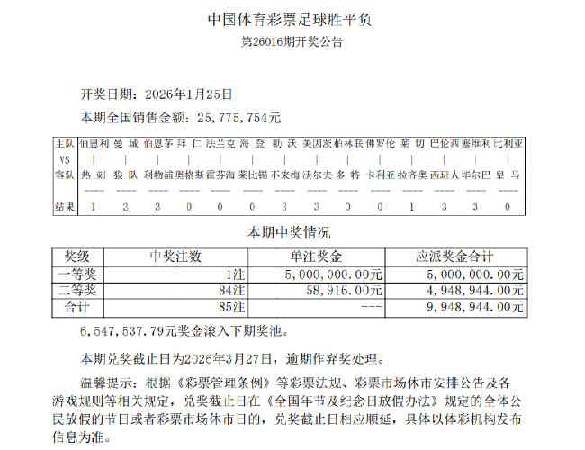 北京时间1月25日,足彩第26016期开奖结果揭晓。本期一等奖仅开出1注,单注奖金500万元,二等奖开出84注,单注奖金58,916元,6,547,537.79元奖金滚入下期奖池。任九开出257注,单注奖金54,296元。本期足彩销量为25,775,754元,任九投注总额为21,803,448元。