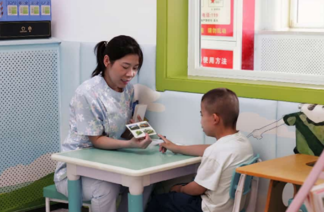 榆林市儿童福利院的特教老师正在教孩子认读。