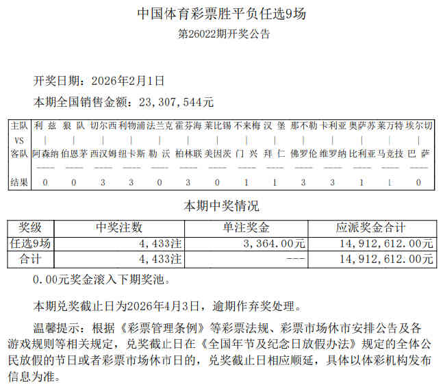 北京时间2月1日,足彩第26022期任九开奖结果继续。本期任九开出4433注,单注奖金3364元。本期任九投注总额为23,307,544元。