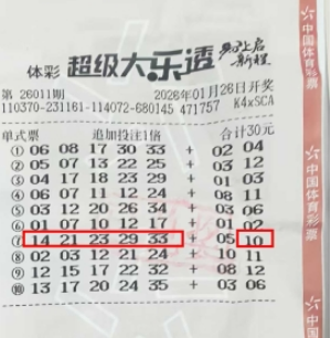 1月28日,体彩超级大乐透第26011期迎来开奖时刻,德州市陵城区一位购彩者凭借一张包含十注号码的长票,幸运斩获二等奖(追加)一注,奖金总计429798元。