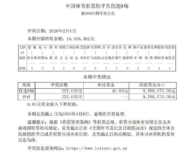 北京时间2月6日,足彩第26025期任九开奖结果揭晓。本期足彩开出火锅奖,任九井喷227,632注,单注奖金仅43元,创2026年新低;本期任九的销量为15,476,482元。