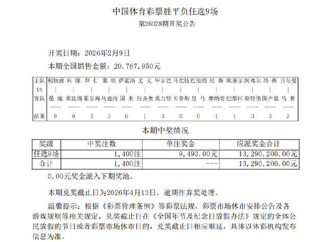 足彩26028期任九开奖:共1400注 单注9493元