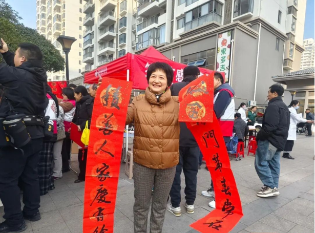 武汉韵湖社区的“福彩送福”活动中,除了写福送福外,还增设“年货集市”,特色农产品、便民义诊、拓印体验等内容一应俱全,居民在家门口就能买得实惠、玩得开心。