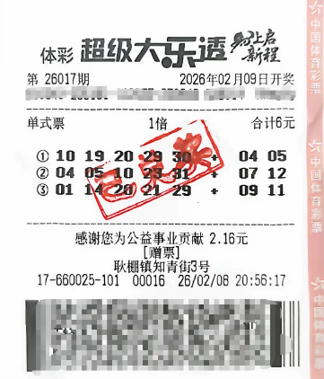 值得一提的是,不久前的2月2日,超级大乐透第26014期开奖时,池州也有一位幸运购彩者,凭借一张6元的套餐票活动赠票,收获了一注一等奖,奖金达1000万元。