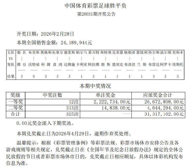 北京时间2月28日,胜负彩第26031期开奖结果揭晓。本期足彩头奖共开出12注,单注奖金2,222,734元,1583万滚存被清空;二等奖开出313注14,838元;任九开1153注8501元。本期足彩销量为24,189,944元,任九投注总额为15,315,116元。
