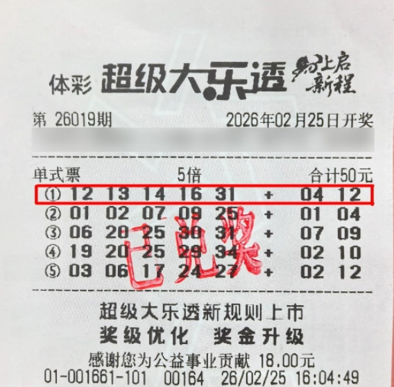 2月25日,超级大乐透新春复市后首期(第26019期)开奖,前区号码为12、13、14、16、31,后区号码为04、12。位于黄浦区西藏南路1415号、编号01661的体彩代销网点成为幸运之地,中出5注基本一等奖,单票奖金高达3764万余元。
