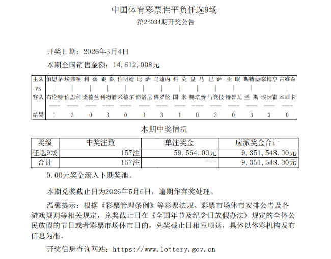 北京时间3月4日,胜负彩第26034期任九开奖结果揭晓。本期任九开出157注,单注奖金59,564元,本期任九投注总额为14,612,008元。