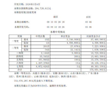 本期全国开出10注一等奖,单注奖金574万元,其中1注选择追加,多得459万元,1注追加头奖落于云南;9注基础头奖分落7地,其中广东、贵州各2注,内蒙古、安徽、山东、云南、陕西各1注。二等奖开出261注2.7万余元,其中74注采用追加投注,每注多得2.2万余元。本期全国销量为2.94亿元,开奖后奖池余额7.53亿,根据大乐透新规,下期固定奖奖金将按8亿以下对照!