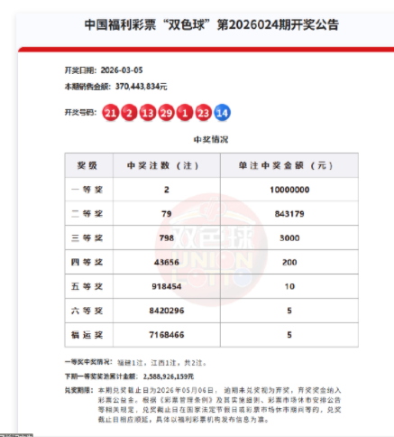 22:10 本期一等奖开出2注,单注奖金1000万元分落福建和江西。二等奖开出79注,单注奖金84.3万余元;5元福运奖开出7168466注。