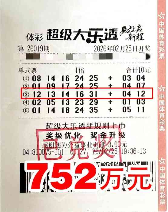 2月25日,体彩超级大乐透春节休市后首期开奖,共开出8注一等奖,其中一注752万元的幸运头奖花落平顶山,这也是2026年平顶山地区的首个超级大乐透一等奖。