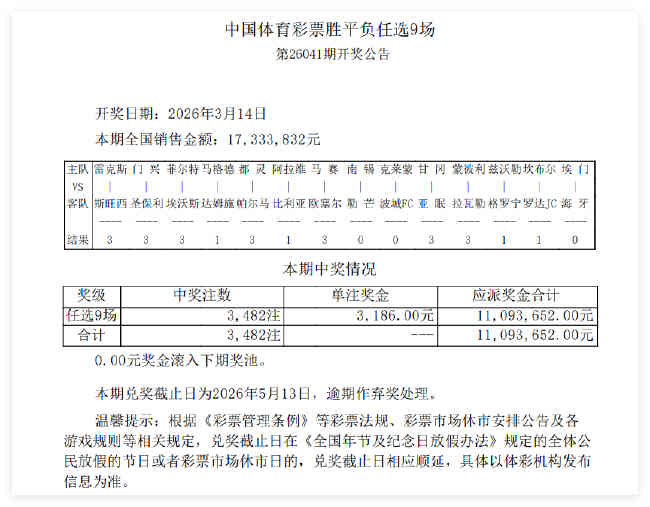 北京时间3月14日,任九第26041期开奖结果揭晓。任九开出3482注,单注奖金3186元。本期任九投注总额为17,333,832元。