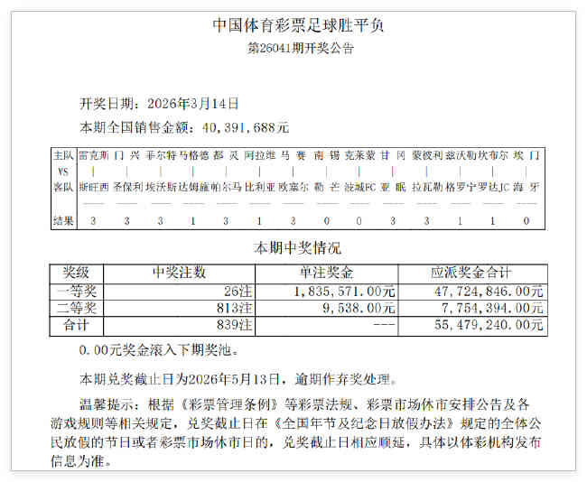 北京时间3月14日,足彩第26041期开奖结果揭晓。14场1等开出26注183万,2962万滚存被清空,14场2等开出813注,单注奖金9538元;任九开出3482注,单注奖金3186元。本期胜负彩销量为40,391,688元,任九投注总额为17,333,832元。