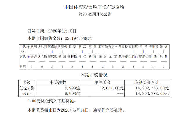 北京时间3月15日,足彩第26042期开奖结果揭晓。本期任选九场开出6993注,单注奖金2031元。本期任九投注总额为22,197,548元。