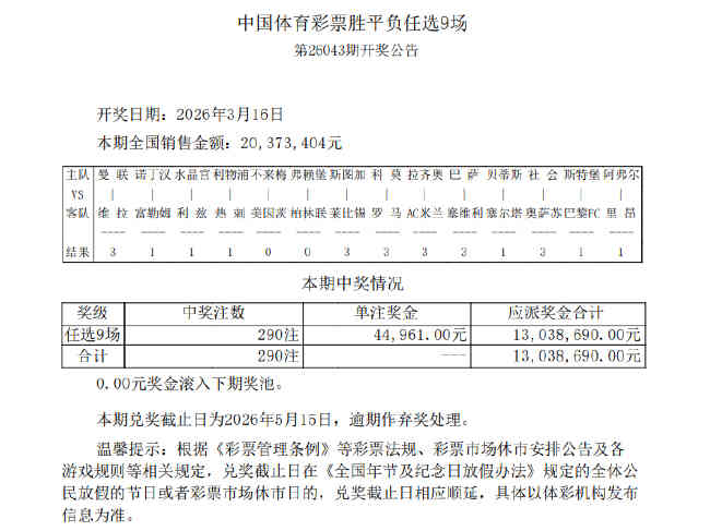 北京时间3月16日,第26043期任九开奖结果揭晓。本期任九开出290注,单注奖金44,961元。本期任九投注总额为20,373,404元。