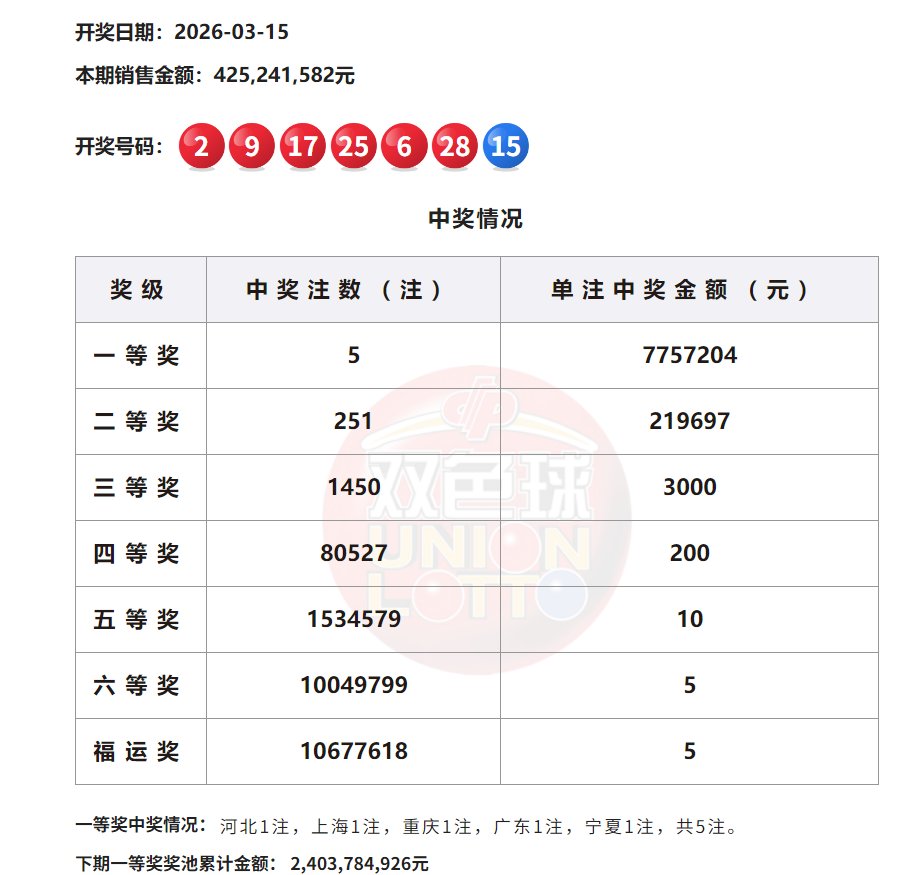 3月15日晚,中国福利彩票双色球游戏第2026028期开奖,本期双色球开奖号码为