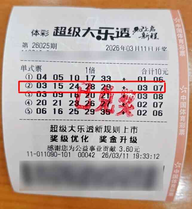 3月11日,超级大乐透第26025期开奖,前区号码为03、15、24、28、29,后区号码是03、07。本期全国销售额达2.99亿元,为国家筹集彩票公益金1.07亿元。