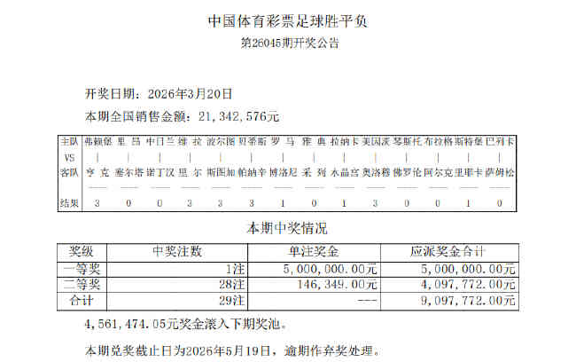 北京时间3月20日,足彩第26045期开奖结果揭晓。本期14场头奖开出1注,单注奖金500万,奖池滚存456万,十四场二等奖开出28注,单注奖金146,349元,任选九场开出547注,单注奖金20,218元。本期胜负彩销量为21,342,576元,任九投注总额为17,280,264元。