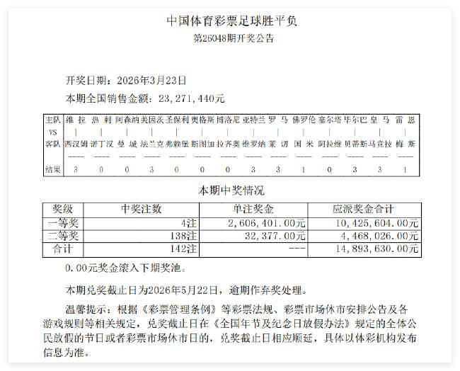北京时间3月23日,胜负彩第26048期开奖结果揭晓。14场1等开出4注,单注奖金260万;14场2等开出138注,单注奖金32377元。任九开出1036注,单注奖金13672元。本期足彩销量为23,271,440元,任九投注总额为22,131,804元。