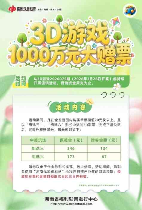 福彩送好运,惊喜享不停。为回馈广大购彩者,3月26日起,福彩3D游戏第2026075期开始,河南福彩在全省范围内,开展3D游戏1000万元大赠票活动,促销资金用完为止。