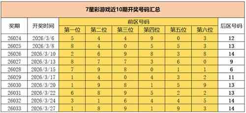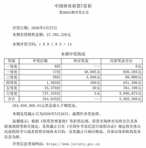 2026年3月27日晚,中国体育彩票7星彩第26033期开奖,当期开奖号码为前区“1 8 9 1 9 3”,后区“14”。