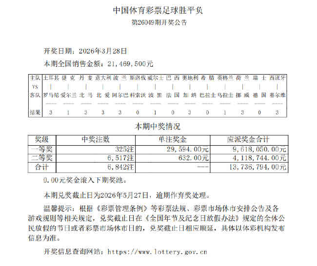 北京时间3月28日,胜负彩第26049期开奖结果揭晓。本期一等奖井喷325注,单注奖金29,594元,二等奖爆出6,517注,单注奖金632元;任九玩法38,427注273元。本期胜负彩销量为21,469,500元,任九投注总额为16,408,348元。