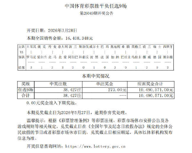 北京时间3月28日,胜负彩第26049期任九开奖结果揭晓。本期任九爆出38,427注,单注奖金273元,本期任九的销量为16,408,348元。