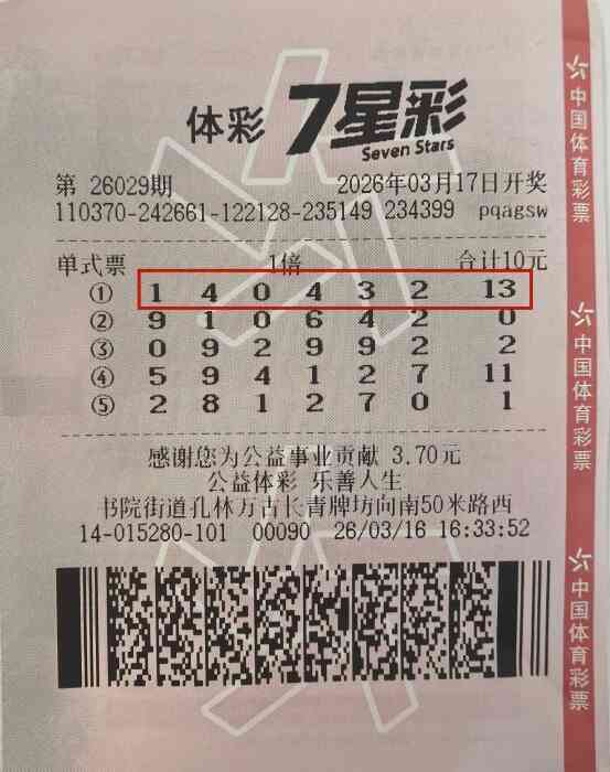 3月17日,7星彩第26029期开奖,中奖号码为“1 4 0 4 3 2 + 11”。老宋惊喜地发现,自己投注的第一注号码与开奖号码高度匹配,仅后区一个号码不同,幸运地收获了二等奖,奖金12.61万元。他感慨道:“我当时就是一时兴起买了注彩票,真没想到能中奖。曲阜不愧是东方圣城,给了我这么棒的游玩体验,以后我肯定还会再来这个福地!”